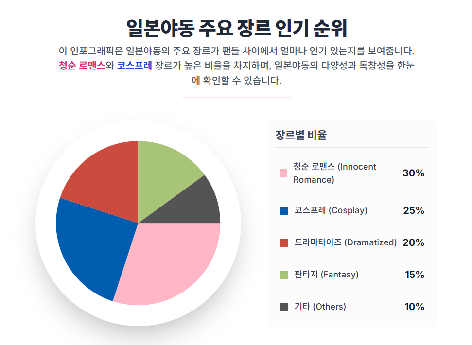 이 인포그래픽은 일본야동의 주요 장르가 팬들 사이에서 얼마나 인기 있는지를 보여줍니다. 청순 로맨스와 코스프레 장르가 높은 비율을 차지하며, 일본야동의 다양성과 독창성을 한눈에 확인할 수 있습니다.