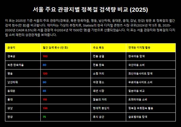 표는 2025년 기준 서울의 주요 관광지(경복궁, 북촌 한옥마을, 명동, 남산타워, 동대문, 홍대, 강남, 한강) 방문 후 정복걸의 월간 검색 횟수(만회)를 비교합니다.