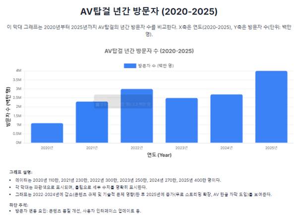 그래프는 2020년부터 2025년까지 AV탑걸의 년간 방문자 수를 비교한다. X축은 연도(2020-2025), Y축은 방문자 수(단위: 백만 명). 2020년 110만, 2021년 230만, 2022년 300만, 2023년 250만 (감소), 2024년 270만 (감소), 2025년 400만 (증가). 각 막대는 파란색으로 표시되며, 툴팁으로 세부 수치를 명확히 표시한다. 그래프는 2022-2024년에 감소(콘텐츠 규제 및 기술적 문제 영향)한 후 2025년에 증가(무료스트리밍 확장, AV한글자막 도입)를 보여준다. 하단 주석에는 방문자 변동 요인(콘텐츠 품질 개선, 사용자 인터페이스 업데이트)이 설명된다. 막대 그래프 형식은 연도별 수치 비교를 직관적으로 제시하며, 연간 트렌드를 명확히 시각화한다.